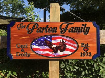 Bright and patriotic personalized wood sign with beautiful American Flag and American Eagle artwork attached. The attached art plaques are made of durable aluminum. This custom wood sign comes with your choice of wording and border color on the left and right ends of the sign (shown with blue). These personalized signs are made in the USA in our Gatlinburg sign shop. Size: 24″ x 10″ x 1″
